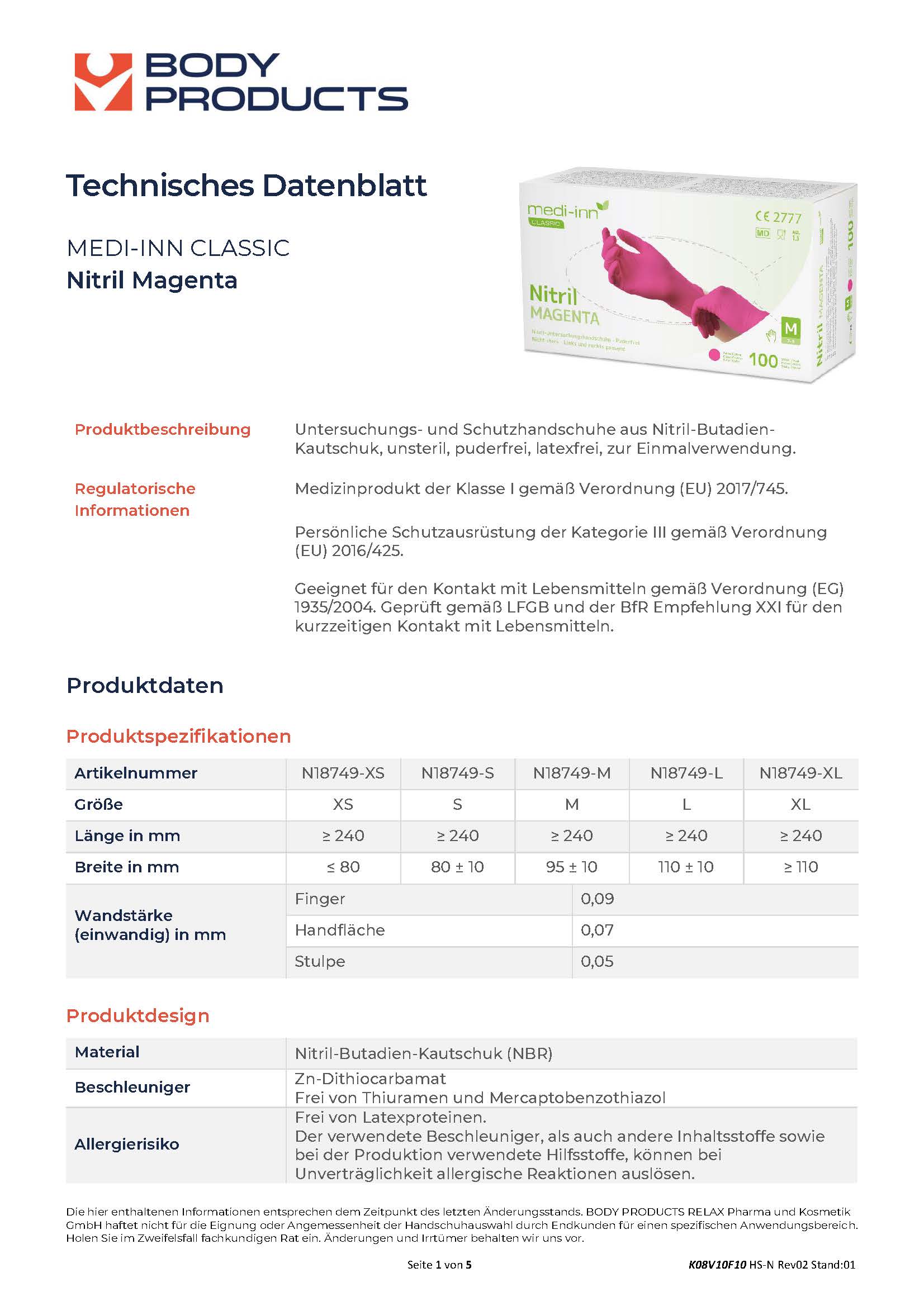 Medizinprodukt der Klasse I gemäß VO 2017/745 geeignet für Untersuchungen/Arbeiten im medizinischen Bereich.
