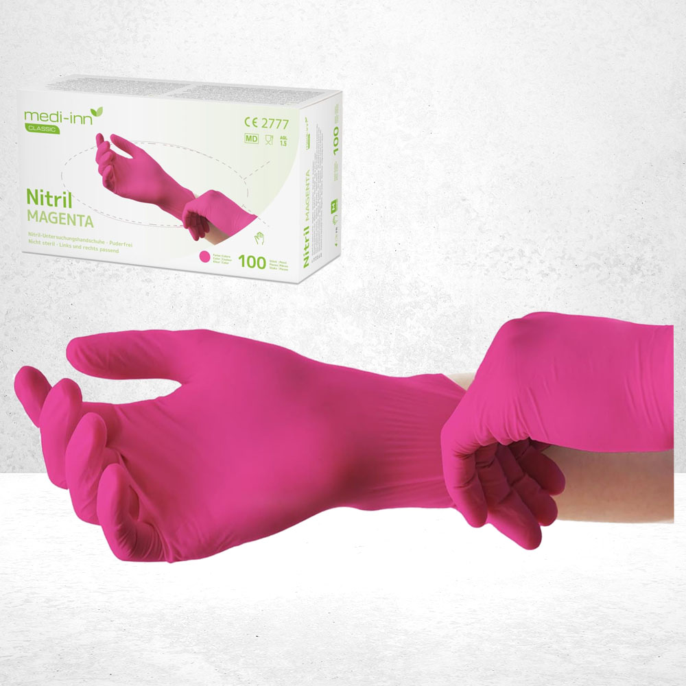 Die sehr gut hautverträglichen und strapazierfähigen Nitril Einmalhandschuhe von Medi-Inn sind zum Schutz vor pathogenen Keimen in der Medizin,